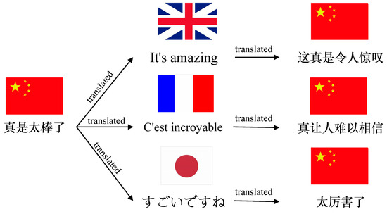 Each topic contains 800 posts, with 600 for training and 200 for testing. Each post includes a unique identifier (ID), target, content, and stance. Given the limited size of the original dataset, a data-enhancement method through back-translation was applied to the training data. The text field of the training dataset was translated using Tencent’s translation API, translating the original Chinese text into English, French, and Japanese, and then back into Chinese. An example of the data-enhancement method is shown in Figure 10. This process expanded the number of training samples per topic from 600 to 2400, while the number of test samples remained unchanged. A comparison of the data volume before and after the data-enhancement method for each topic is shown in Table 2, significantly increasing the dataset’s size and diversity.