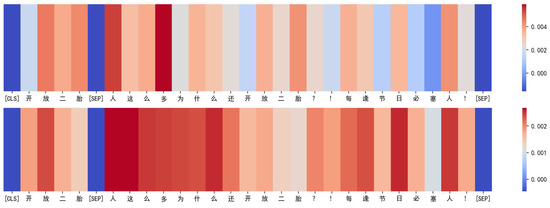 The attention weights of the example in hybrid network model and multi-task learning model. The figure above depicts the attention weights of an example in the hybrid network model, while the figure below depicts the attention weights of the same example in the multi-task learning model. The example translated into English is “[CLS]Open second child[SEP] Why are so many people still opening second child?! Every festival is crowded! [SEP]”.