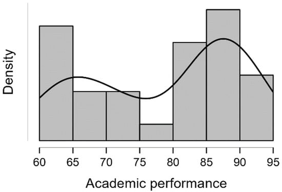 Group descriptives of academic performance are shown in Table 6. The Shapiro–Wilk test was used to examine the exam scores indicating learners’ academic performance in two groups for normality (please see details in Table 7). Although the result of the control group showed the data were in line with normal distribution (p = 0.889), the result of the experimental group (p < 0.001) was not greater than 0.05, showing the data of the experimental group were considered not to be in line with normal distribution. Further, the distribution in Figure 1 intuitively presents the characteristics of the academic performance data in the experimental group: two subgroups were stratified, one with lower performance, and the other with higher.