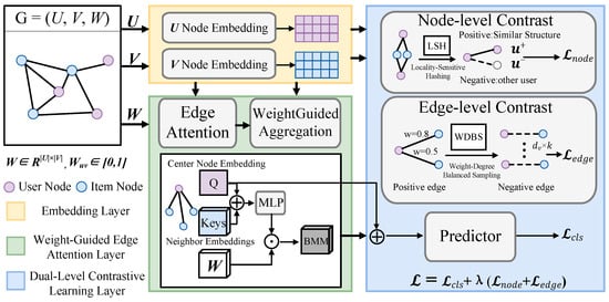 In this section, WePred is a weight-guided contrastive learning framework for bipartite link prediction. Our model comprises three key components: (1) a weight-guided edge attention mechanism for adaptive neighbor aggregation, (2) a dual-level contrastive learning framework combining edge-level and node-level contrasts, and (3) a unified learning framework which integrates the classification and contrastive objectives. Figure 1 provides an overview of our proposed architecture.
