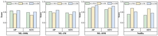 We conducted experiments on four widely used benchmark datasets: ML-100K, ML-1M, ML-10M, and Netflix. The results were evaluated using two metrics: the area under the curve (AUC) and average precision (AP). Figure 2 presents the detailed results of our ablation studies. In terms of the impact of weight-guided attention, WePred with weight-guided attention consistently outperformed the w/o WA variant across all datasets. For example, on ML-100K, removing weight attention reduced the AUC from 0.8331 to 0.8247 and the AP from 0.8048 to 0.7952. This demonstrates that our weight-guided attention mechanism effectively captures the importance of different neighbor relationships, contributing to the predictive power of WePred. For the effectiveness of dual learning, the removal of dual learning (w/o DL) significantly impacted WePred’s performance. We observed substantial performance deterioration across all datasets, with the most notable impact being on Netflix, where the AUC dropped from 0.8078 to 0.8755 and the AP dropped from 0.7841 to 0.8662. This suggests that our dual learning approach effectively leverages both local and global structural information for link prediction. As for the impact of weight-degree balanced sampling, the complete WePred model with WDBS demonstrated better performance compared with that without WDBS (w/o DS) across most datasets. The improvement was particularly evident in ML-10M, where using WDBS led to achieving an AUC of 0.9284 compared with 0.8773 without it. This validates our hypothesis that considering node degrees in negative sampling helps generate more informative negative examples for WePred training. Finally, regarding the overall analysis, the ablation studies demonstrated that all three components contributed substantially to the performance of WePred. Among them, the WDBS strategy appears to have had the most significant impact, as evidenced by the larger performance gaps between the full WePred model and that w/o DS. This was followed by the dual learning strategy and weight-guided attention mechanism, both of which showed meaningful contributions to the effectiveness of WePred. These results collectively validate our design choices and demonstrate that each component plays an essential role in the overall framework. The complementary nature of these components helps WePred achieve superior performance compared with existing approaches.