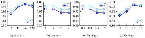 The temperature parameter in contrastive learning controls the sharpness of the similarity distribution. We examined , with the results presented in Figure 3d. The performance improved as increased from to , reaching peak performance at (AUC , AP ) before slightly declining at . This pattern suggests that a moderate temperature value helps create more informative contrasts between positive and negative samples, while extreme values may either make the contrasts too sharp (low ) or too smooth (high ).