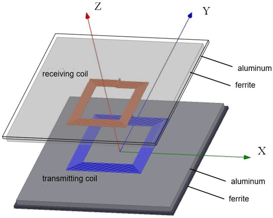 The simulation was carried out using Ansys Maxwell 15.0, and the model is shown in Figure 2. The transmitting coil and the electromagnetic shielding layer below it were fixed, while the receiving coil and the shielding layer above it were adjusted to change the relative positions. The condition of vertical and horizontal misalignment was discussed.