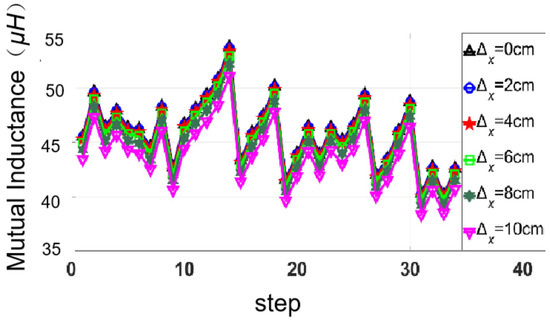 When the receiving coils migrated along the X-axis, the mutual inductance is shown in Figure 6.