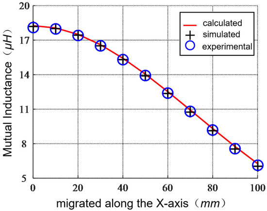 When the receiving coil and the transmitting coil are in parallel planes but not coaxial, the misalignment distance of the receiving coil along the X-axis is . The calculated, simulated, and experimental values of mutual inductance are shown in Table 3, the receiving coil at height is 75 , and is from 0 to 100 with a step size of 10 .