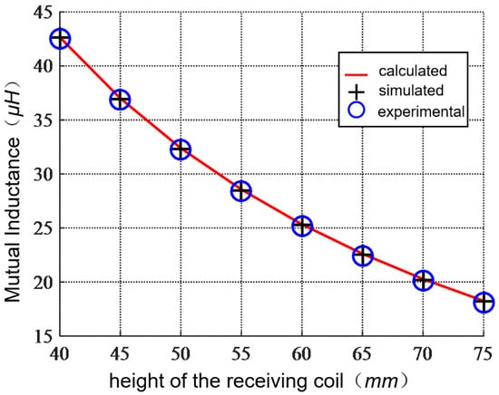 The simulation results of vertical misalignment of the receiving coil show that it migrated from a height of 40 to 75 . During the process, the relative position between the shielding layer above the receiving coil and the receiving coil is unchanged. The calculated, simulated, and experimental values of mutual inductance are shown in Table 2.