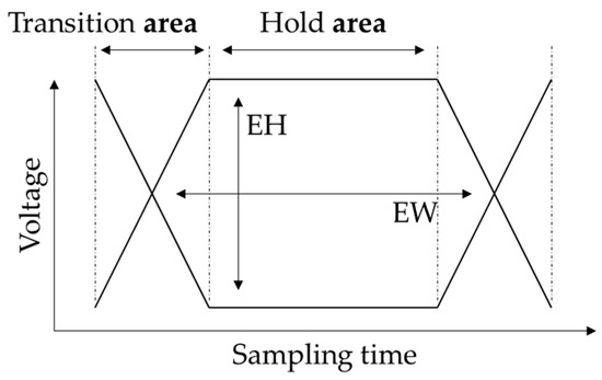 The eye diagram is a critical SI metric that shows the electrical performance in a graphical manner in the time domain [6,7]. The eye diagram is obtained by overlapping the received waveforms at every unit interval (UI). As a result of overlapping the waveforms, the accumulated waveforms can show how reliable the received ONEs and ZEROs are. The reliability corresponds to how far apart the distribution for ONEs are from the distribution for ZEROs in the voltage. The parameter that shows the distance between the distributions is eye height (EH), as shown in Figure 1. Likewise, in the sampling time, eye width (EW) shows the reliability of the received waveforms. The transmitted signal is a rectangular pulse with an amplitude or none depending on the data bit. When the rectangular pulse has an amplitude, the pulse can be separated into transition and hold areas. Typically, the transition area corresponds to the rising and falling edges of the rectangular pulse. The hold area is the timing interval with a constant non-zero voltage or zero voltage. The distance between the distribution of the rising edge and the distribution for the falling edges corresponds to the EW. The ideal EH value is the voltage difference between HIGH and LOW, and the ideal EW value is 1 UI, which is a reciprocal of the given data rate. If the above eye diagram parameters are much different from the ideal case, then the corresponding eye diagram is interpreted as significantly lossy in terms of electrical performances. Hence, the channel has to be designed for the eye diagram to have eye parameters that are close to the ideal values.