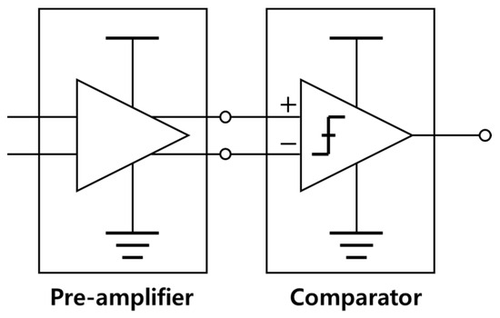 The typical DFE has two inputs: the received signal and the threshold voltage. A slicer in the DFE circuits consists of multiple stages to successfully compare the received signals to the threshold voltage, as can be seen in Figure 2. The first stage is generally a pre-amplifier to amplify the voltage difference between the two inputs before making a bit decision. In the next stage, the comparator compares which signal is greater and decides the output logic afterward.