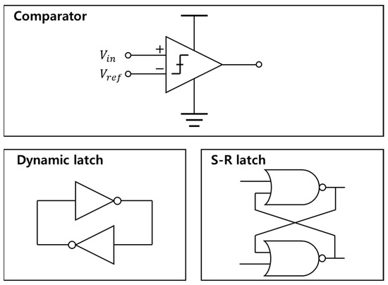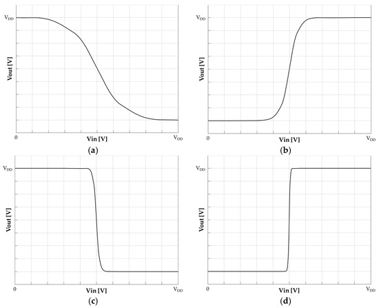 The inputs are the input voltage and the reference voltage from Figure 3. In the case of optimal timing, the input voltage is obtained from the maximum peak of the bit responses. The amplitude is certain compared to other sampling timings. The certainty means it is large enough to make a decision. Figure 4 shows how the voltage transfer behavior of the dynamic latch changes depending on the iteration. As the dynamic latch operates recursively, the dynamic latch becomes ideal, which means that the dynamic latch has an abrupt curve near the threshold voltage. If the input voltage is not large enough compared to the rail voltages, such as VDD or 0 V, then the dynamic latch has to operate recursively until the output voltage converges to one of the rail voltages.