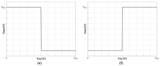 Outputs of the dynamic latch depending on iterations. (a) The voltage transfer function between the input and output. As the dynamic latch operates recursively, the output voltages become an ideal switch (b–e). After the iterations, the voltage transfer is close to an ideal buffer (f).