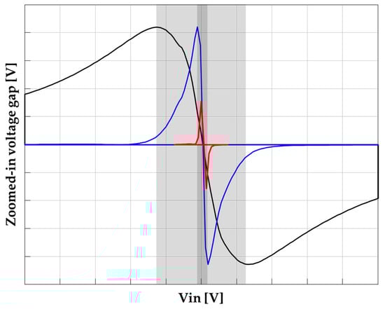 Zoomed-in voltage gap for the inverter in forward (Figure 5a). The gray zone exists around half of the VDD. As the dynamic latch operates recursively, the gray zone becomes smaller.