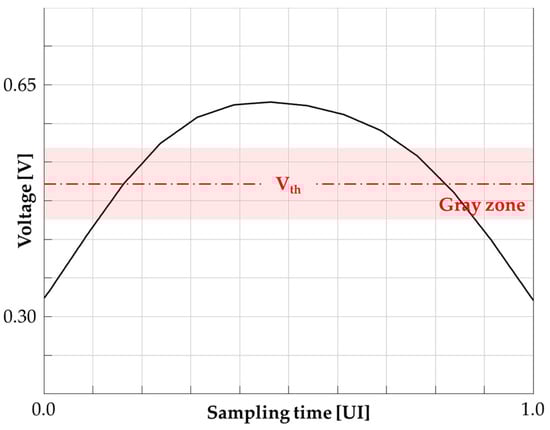 Figure 7 shows the main cursors with the threshold voltage to represent the gray zone by the latch model. When the bit decision is made at around the threshold voltage, the slicer has a gray zone, making it hard to clearly distinguish the logic level. The gray zone is applied to the ISI’s PDF and the ONE’s PDF; thus, the nonideal DFE with the nonideal latch model is integrated into the statistical eye diagram.