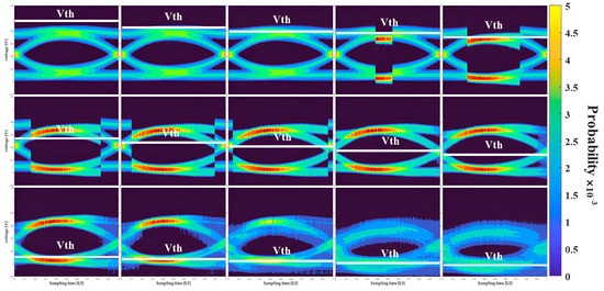 The shmoo plot is widely used in semiconductor industry [10,11]. The shmoo plot intuitively shows the system BER performances depending on system conditions such as operation voltage, clock speed, and sampling time. In other words, the shmoo plot may have various x-axes and y-axes depending on which factor is under test. The threshold voltage is one of the typical y-axis parameters in the shmoo plot. In that case, the shmoo plot is equivalent to the BER eye diagram, which can be converted from the statistical eye diagram. The statistical eye diagram provides the PDFs depending on the sampling time and the voltages. The BER eye diagram can be obtained by applying the cumulative summation to the positive and negative directions. Therefore, the statistical eye diagram is also beneficial in terms of the system analysis.