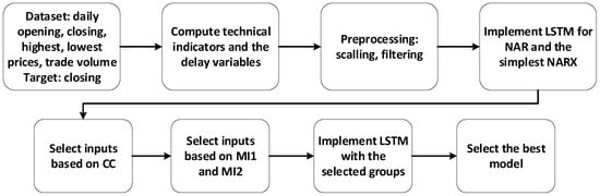 The rest of the article is organized as follows: Section 2 reviews related works regarding the use of MI, prediction models, and cryptocurrency forecasting. Section 3 describes the technical indicators (from the financial market) used as potential exogenous variables, the mutual information indicator and calculation algorithm, the NARX model, the LSTM network, and the methodology used. Section 4 describes the experimental results obtained using the time series representing the exchange rates of three very popular cryptocurrencies. The comparative analysis against other state-of-the-art studies and further discussions are presented in Section 5. Section 6 concludes and highlights future directions of research. The strengths and the limitations of our approach are also reported in the final parts of the article.