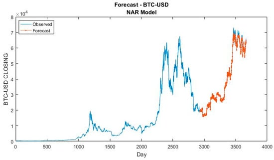 The comparative analysis pointed out that the use of LSTM and the proposed selection method to derive the NARX model is by far the most successful price predictor for the considered cryptocurrencies, from the point of view of MAPE. Note that our study benefits from the availability of longer datasets; therefore, results are more meaningful. For RMSE, our results are best or very close to the best ones. The only better result for RMSE was obtained in [] and only for BTC, but on a shorter dataset, and is paired with a weaker MAPE value.