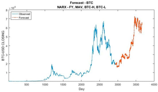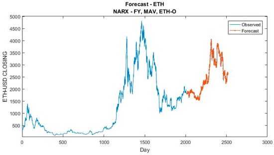 The main aim of the proposed methodology is to define the optimal NARX model, where the optimality is established by a set of accuracy indicators. We adopted the standard choice for external variables which considered the asset-related variables and the indicators coming from technical and fundamental analysis. The crypto market is different from regular markets, and a model considering other indicators such as politics and regulations factors could be more suitable. At this time, this is a limitation of the proposed methodology.