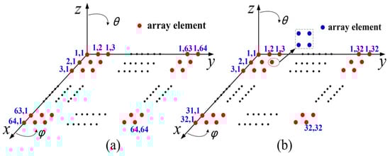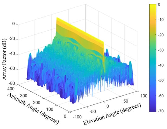 For the full 64 × 64 array, θ and φ denote the azimuth and elevation angle, and the response of the (m,n)th array element is . Therefore, given the distribution of the array, the array radiation pattern can be obtained as