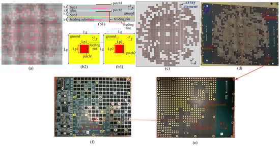 Array structure and array element of the proposed thinned array. (a) Structure of the thinned array with 2400 elements (the “red box” represents the active element, and the “white box” represents no elements). (b) Structure of the array element: (b1) side view, (b2) top view of Sub1, and (b3) top view of Sub2; h1 = 0.381, h2 = 0.381, h3 = 0.1 mm, h4 = 0.203, Lp1 = 2.4, Lp2 = 2.6, Lg = 5, units: mm. (c) Model of the proposed thinned array with 2400 elements and an element spacing of 5 mm. (d) Fabricated prototype of the proposed thinned array with 2400 elements. (e) Top-down view of the bottom-right quarter of the array. (f) Bottom-up view of bottom-right quarter of the array.