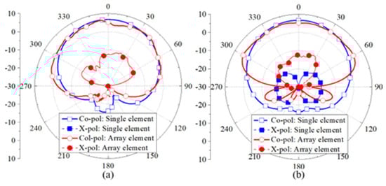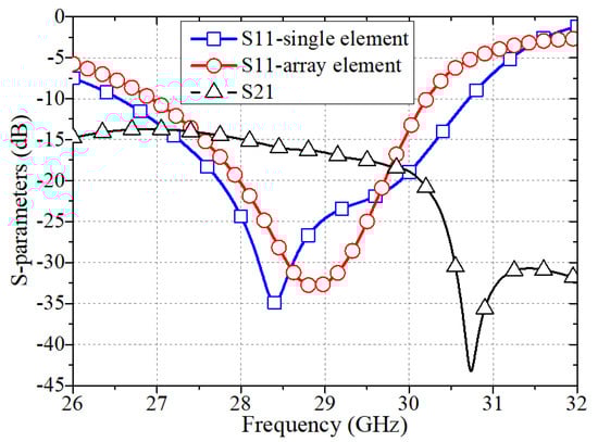 Figure 3 shows the simulated S-parameters of the array element in the cases of a single element (Figure 2b) and in the array (Figure 2c). In both cases, the overlapped −10 dB impedance bandwidth covers 3 GHz (27–30 GHz). The S11 in the cases of single element and in the array are similar. Additionally, the mutual coupling between each element in the array is lower than −14 dB. Figure 4 shows the simulated radiation patterns of the array element in the cases of single element (Figure 2b) and in the array (Figure 2c) at 29 GHz. For the two cases, the simulated gain is about 5.5 dBi. The cross-polarization level is lower than −25 dB and −15 dB for the case of the single element and the case in the array, respectively.