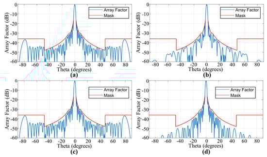 A 2 × 2 subarray was designed for the full 64 × 64 array, where the sidelobe constraints are . The binary integer matrix was defined as the optimization variable. Here means that 2 × 2 subarray was placed and means that 2 × 2 subarray was not placed at one of the four positions , or . Therefore, the selection matrix was achieved for the full array, where denotes the Kronecker product and denotes the 2 × 2 matrices.