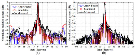To verify the array factor, the radiation patterns of the array model in Figure 2c and the radiation patterns of the array prototype in Figure 2d are simulated and measured, respectively. The simulated 3D radiation pattern is shown in Figure 7. Figure 7 shows that the proposed thinned array can form a sharp beam with a high gain. The simulated and measured normalized radiation patterns in the φ = 0° and φ = 45° cut-planes are shown in Figure 8. From Figure 8, it is evident that the simulated radiation patterns match the array factor very well. The high sidelobe level at the large elevation angle might come from the radiation of the fringing field. Also, Figure 8 shows that the measured radiation patterns agree with the simulated ones. The slightly higher sidelobe level might come from the metal screws and the measured error.