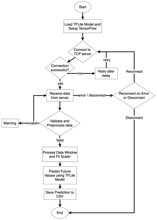 - The inference codeThe software for the inference is based on Python 3.11, leveraging libraries such as NumPy 1.26.3, Pandas 2.1.4, uJson 5.4.0, TensorFlow 2.15.0, and Sci-kit learn 1.2.2. Data acquisition begins with readings from a TCP server, which are preprocessed to eliminate erroneous values or measurements outside the acceptable range. Values exceeding this range trigger a warning, which the notification system records. Similarly, if the model predicts a value that is too high or too low, a warning is also triggered to signal potential anomalies. For error values (e.g., NaN), the algorithm ignores them to prevent distortion in the data. In the event of a disconnection from the TCP server, the program automatically attempts to reconnect after one second. After collecting enough valid measurements, the pre-trained model is loaded, and predictions are generated using a sliding window approach with a span of 20 values. This method ensures that each new measurement dynamically updates the forecast, providing precise and timely insights into sensor behavior while maintaining accuracy and detecting potential anomalies in real-time. To tailor predictions to the unique characteristics of each node, a personalized MinMax Scaler is trained for every sensor. This personalized scaling not only enhances the accuracy of the predictions but also facilitates the monitoring and maintenance of individual nodes, ensuring consistent performance across the network. A flowchart of the algorithm is shown below in Figure 4.
