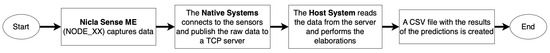 As represented in Figure 6, the concentrator’s primary function is to aggregate data from multiple peripherals. Utilizing a container built on Node.js version 16 and the open-source library node-ble, this system intelligently differentiates between Host and Native configurations based on peripheral addresses and settings. It establishes smooth connections with the targeted peripherals and carefully records the data streams from the Nicla Sense ME sensors. The acquisition frequency is calibrated to capture measurements at a rate of one per second. Once connections are established and the necessary data are acquired, the container publishes the raw data locally using a TCP server. The Native container employs the node-ble library and Bluetooth connections to broadcast native measurements. Each line of the data file includes the peripheral’s MAC address, the measured characteristic’s value, and the sensor it uses (internal or external, in case an external sensor is attached). The software version for the sensor nodes was v0.6.0 and the Concentrator v0.1.0, both properties of AROL Closure Systems (Canelli, IT).