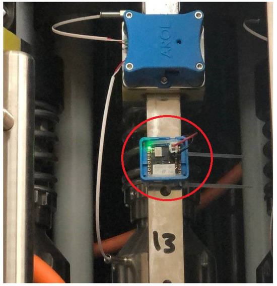 The Nicla Sense ME (Arduino, Ivrea, Italy) was used as a sensor node; it exemplifies a trio of strengths: compact design, cost-effectiveness, and energy efficiency, while seamlessly integrating four state-of-the-art sensors engineered by Bosch Sensortec. The acronym “ME” stands for “Motion” and “Environment”, highlighting its capability to accurately detect rotation, acceleration, temperature, humidity, pressure, air quality, and CO2 levels with industrial-grade precision. This latest version sets a new benchmark with its ultra-compact size, enabling effortless data transmission via Bluetooth Low Energy (BLE) 4.2, powered by the ANNA-B112 module. In the experiment, 50 Nicla sensors were used, both in the laboratory and on the machine. Their primary role was to transmit temperature, humidity, and pressure data to the concentrator using the wireless protocol.