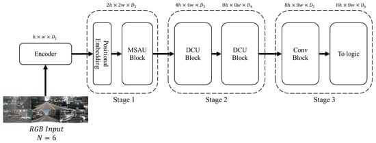 In the proposed system, the cross-view attention mechanism from the CVT (Cross-View Transformer) architecture is leveraged to extract multi-scale image features from a set of six camera images. Particularly, such a mechanism aggregates image features and spatial information to generate spatially-aware feature embeddings. Then, the decoding process with several improvements for BEV semantic map generation is redesigned, resulting in a final BEV semantic map with a resolution of 200 × 200. In the following, Table 1 and Table 2 show the list of abbreviations and quantifiers used in our method and their corresponding meanings, respectively.