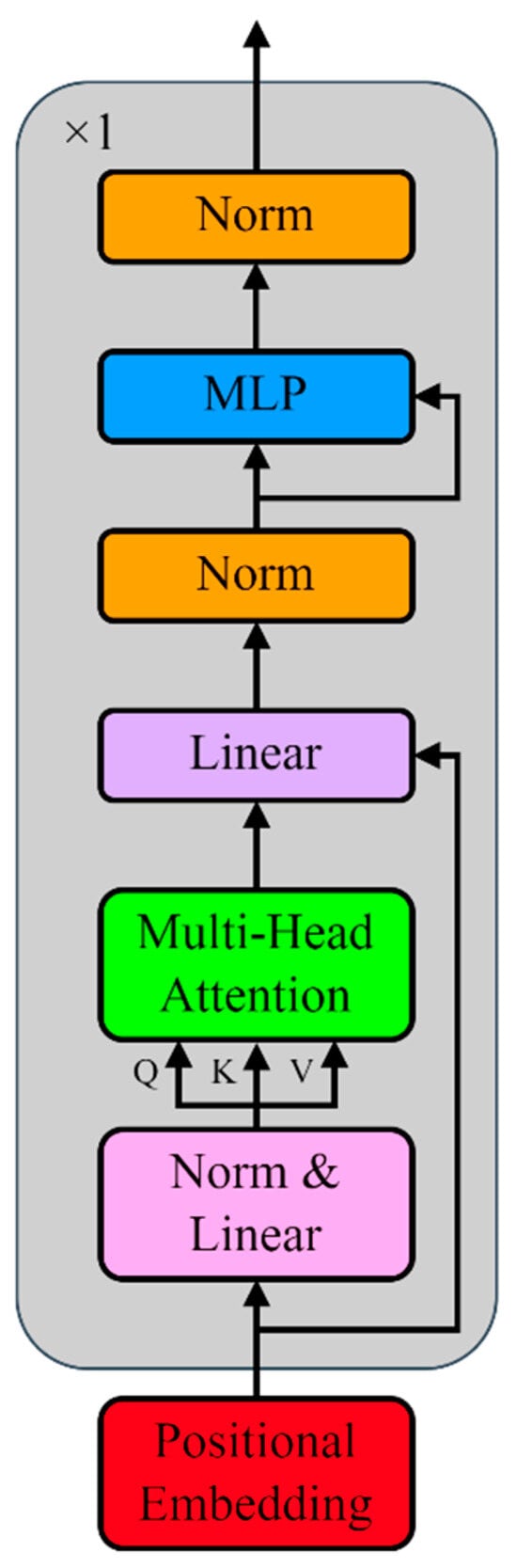 Each attention head independently calculates the linear projections of query , key , and value . For the input feature map , we first map it to the feature spaces of , , and through linear transformations. The linear transformation matrices are defined as in Equation (3), where and represent the feature dimensions of and , respectively, for each attention head.