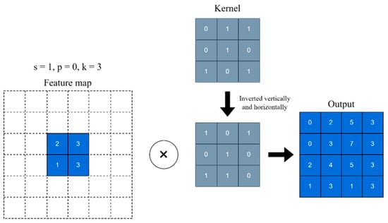 This operation involves inserting zeros between each input pixel and padding the feature map with rows and columns of zeros to expand its size. The kernel matrix is then flipped vertically and horizontally. Finally, a standard convolution operation is applied to the interpolated feature map using the flipped kernel, producing the upsampled output. This method allows for precise control over the upsampling factor, and the parameters are learned during training. This means the network can automatically adjust the parameters to suit specific task requirements. Figure 3 illustrates an example with , and a kernel.