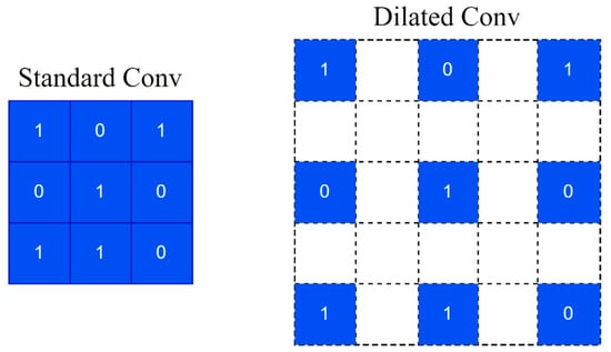 Dilated convolution can be described as introducing a dilation rate into the standard convolution operation. This dilation rate determines the spacing between the elements of the kernel. is the value at position in the input feature map, is the value at position in the output feature map, is the size of the kernel, and is the weight at position in the kernel. With a dilation rate of , the spacing between kernel elements during the convolution operation becomes pixels. This leads to Equation (6):