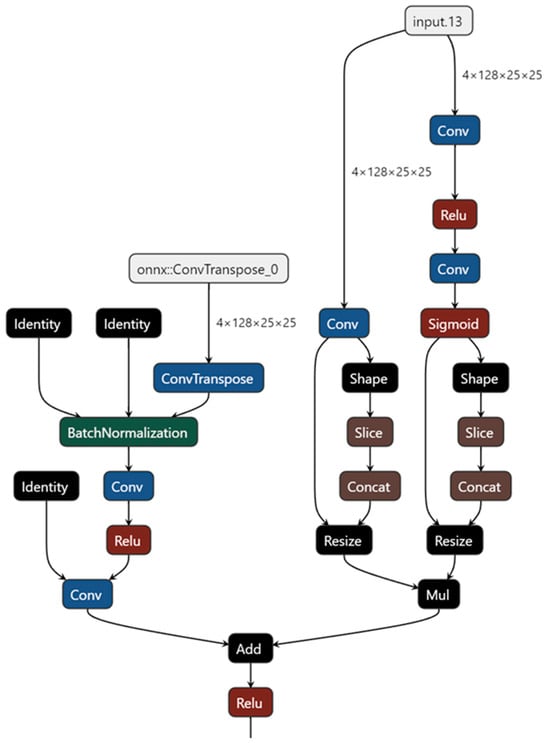 The network architecture is illustrated in Figure 7. First, a pointwise convolution reduces the channel dimension of the input feature map to of its original size. This operation performs a linear combination of channels without altering the spatial dimensions, reducing computational overhead. Batch normalization is then applied to standardize the output of the convolutional layer, accelerating training and stabilizing the numerical distribution of the feature maps. A ReLU activation function introduces non-linearity, enhancing the model’s expressive power and mitigating the vanishing gradient problem. Finally, another pointwise convolution transforms the feature map into a single-channel attention map. The attention weights are then normalized to the range of using a Sigmoid activation function. This output serves as a weighted mask for the feature map, emphasizing important features.