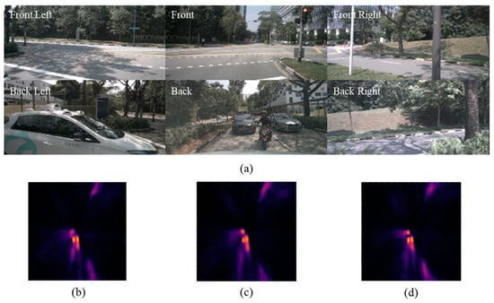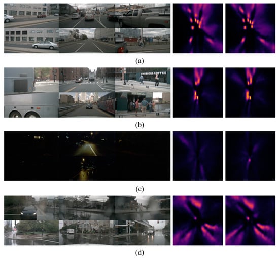 As illustrated in Figure 8, the qualitative comparison aligns with our initial expectations. In contrast to directly applying convolutional operations, the multi-head attention mechanism demonstrates superior spatial awareness, enabling the model to focus on distinct regions concurrently. Each attention head specializes in capturing different facets of features (e.g., shape, size, orientation), thereby enhancing the accuracy and robustness of object detection. The output of the multi-head attention module, which encapsulates relevant features and spatial relationships, serves as the input for the transposed convolution layer. This integration ensures that the spatial details and relationships learned by the attention mechanism are preserved and reinforced during the upsampling process. Consequently, this leads to more accurate and informative Bird’s-Eye View representations, as depicted in Figure 8c. The multi-head attention module excels at capturing long-range dependencies and local details within the image, particularly for low-confidence, partially occluded objects. Conversely, the transposed convolution module focuses on recovering the spatial details lost due to repeated pooling or downsampling operations. The synergy between these two modules empowers the model to accurately comprehend global contextual information while meticulously recovering spatial details, significantly enhancing the quality of feature maps.