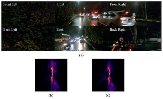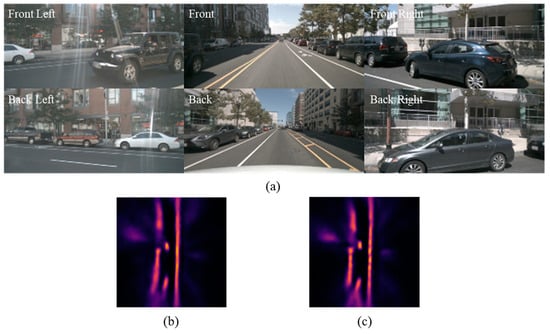 To accurately represent the direction and position of camera-captured images in the BEV space, precise localization of the camera’s coordinates relative to the center of the BEV segmentation map, as well as its orientation and intrinsic parameters, is required. The nuScenes dataset provides camera extrinsic parameters, using and to describe the transformation from each camera’s coordinates to the global 2D coordinates . Following prior work [17,20], we designate the location of the Front Radar as the center of the BEV segmentation map, transforming each camera’s world coordinates into the global 2D coordinates through computations involving and . Additionally, the nuScenes dataset provides intrinsic parameters, such as focal length, principal point, and distortion coefficients, which represent the relative positional relationships of objects in the images. By accurately computing both the extrinsic and intrinsic parameters, our BEV segmentation map achieves more precise localization of the vehicle’s position and orientation in the camera-captured images.