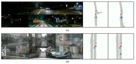 A visualization of model prediction results, i.e., vehicles and roads: (a) nighttime; and (b) daytime. Ego Vehicle (Red) and Predicted Vehicles (Blue).