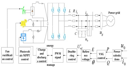 Figure 1 shows the topology of the wind–solar–storage microgrid system, including wind–solar distributed power generation, supercapacitor energy storage, inverter, line impedance, VSGs (virtual synchronous generators), local load, and power grid. Among them, the wind and solar units are controlled by rectification and MPPT, and then the energy is transmitted to the grid through the inverter and line impedance. Super battery energy storage realizes charging and discharging through energy management control. In order to avoid the disadvantages of the microgrid with weak damping and low inertia, a double closed-loop control method with VSG as the core is adopted, and the VSG is employed to generate PWM signals [28], which are then transmitted to the inverter, thereby improving the stability of the microgrid.