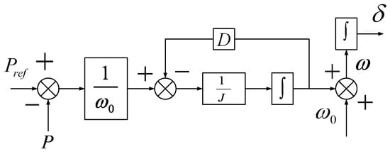 The active power frequency regulation of the VSG is achieved through two mechanisms: the rotor motion equation and droop control. The control process is depicted in Figure 2: