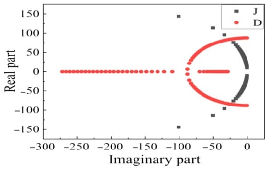 As shown in Figure 4, the pole changes with the damping coefficient D while the moment of inertia J remains constant. With the increase in the damping coefficient, the pole gradually approaches the negative real axis from the negative imaginary axis, and the system tends to be stable. Conversely, when the damping coefficient D is constant, the pole changes with the moment of inertia J. If the J value is small, the system shows under-damping characteristics and the stability decreases. However, if the J value is large, it may lead to excessive frequency deviation and system instability.