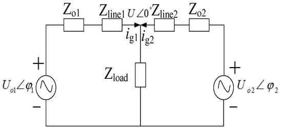 In Figure 6, and represent the output voltages of the inverters; and are the equivalent impedances of the two virtual synchronizers; and are the line impedances.