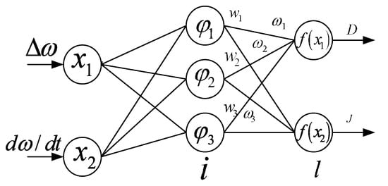 Traditional adaptive control has problems such as inflexible parameter adjustment and inaccurate parameter adjustment [37]. Therefore, this paper introduces the neural network algorithm into VSG control and uses its powerful learning ability to adjust the control parameters. Neural network algorithms can simulate the human brain nervous system and are widely used by virtue of their simple structure and strong learning ability and have a good ability to deal with nonlinear functions, including input layer, hidden layer, and output layer. In this study, the radial basis function network (RBF) algorithm is utilized, and its structure is shown in Figure 7.