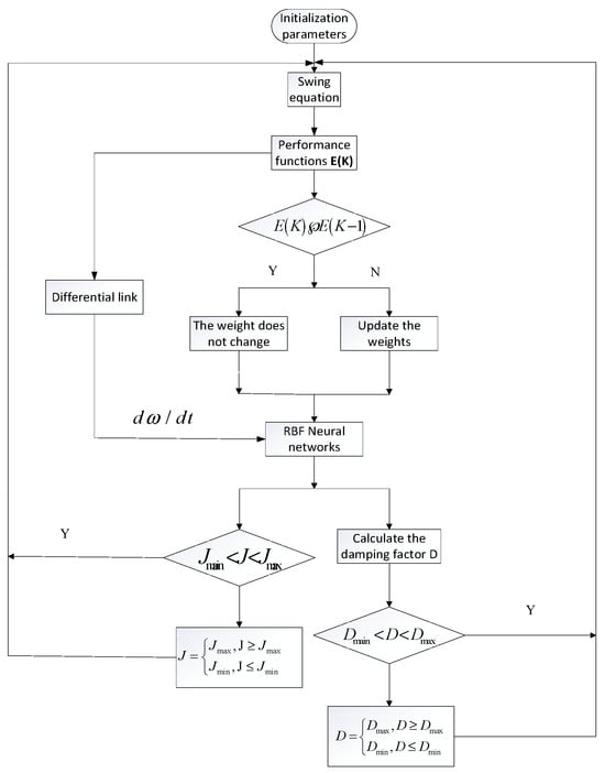 From Figure 8, it can be observed that the process of adaptive control for inertia (J) and damping (D) proceeds as follows: Firstly, the damping coefficient is calculated according to the optimal damping ratio. Then, based on the optimal damping ratio and the RBF neural network algorithm, the corresponding values of the moment of inertia and damping coefficient are adaptively adjusted. The control strategy suppresses the circulation in the system to a certain extent, and on this basis, the virtual impedance is continued to be introduced for adjustment, which can further suppress the circulation and improve the power allocation accuracy of VSG.