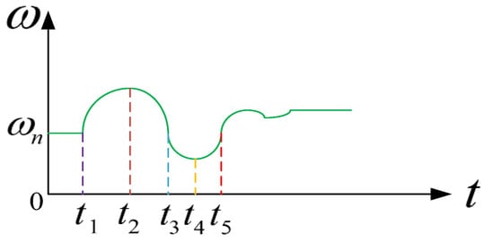 To determine the adaptive regulation law of inertia J and damping coefficient D when the microgrid undergoes changes, this paper thoroughly analyzes the oscillation characteristic curves of the power angle and angular frequency. It can be observed from Figure 9 and Figure 10 that the active power fluctuates significantly, the critical stability point changes continuously, and the angular frequency also changes with the fluctuation of the active power. The change in angular frequency can be divided into four stages: in the initial stage (T1–T2), the angular frequency gradually decreases to zero, indicating that the difference between the actual value of the angular frequency and the rated value increases, and the active power working point close to the point B from the point A, resulting in the deterioration of the operating state of the microgrid. In order to improve this state, it is necessary to increase the values of inertia and the damping coefficient. In the second stage (T2–T3), the angular velocity rate of change gradually becomes negative, the actual angular velocity is close to the rated angular velocity, and the active power working point moves from point B to point C and approaches the maximum output power. Therefore, in order to improve the running accuracy, the inertia value should be increased appropriately, and if the angular frequency fluctuation is too large, it is necessary to increase the damping coefficient to suppress its fluctuation. The pattern of change in the latter two stages is similar to that in the first two stages. In summary, when the microgrid changes, the adaptive adjustment law of inertia J and damping coefficient D can be summarized as shown in Table 1.