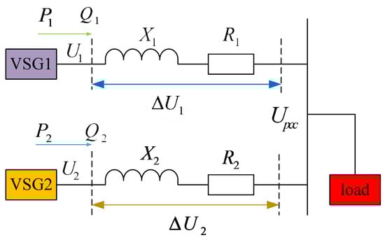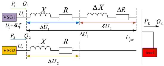 In this paper, an adaptive virtual impedance controller is designed based on the equivalent model of the parallel VSG control structure, which can better reduce the circulation current between VSGs and solve the power allocation problem. As shown in Figure 11, U1 and U2 are the input voltages of the two VSGs, respectively. X1 and R1 are the inductors and resistors of the VSG1 system; X2 and R2 are the inductors and resistors of the VSG2 system; P1 and Q1 represent the power emitted by VSG1; P2 and Q2 are the power emitted by VSG2; ∆U1. ∆U2 represents the voltage loss of the two systems.