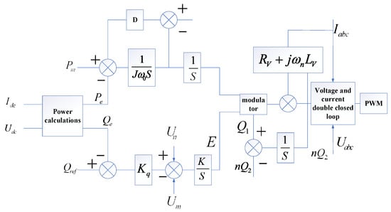 There are problems such as inertia and insufficient damping in microgrids, which easily cause large frequency and voltage deviations. When the system is disturbed, it may stop operating. To address these issues, virtual synchronous generators (VSGs) are introduced into microgrids to provide inertia and damping, thereby overcoming the inherent problems of low inertia and weak damping in microgrids [29,30]. The control strategy of a VSG can be divided into two key components: (1) active power frequency regulation (2) reactive power voltage regulation.