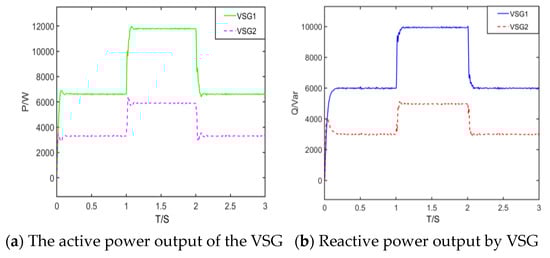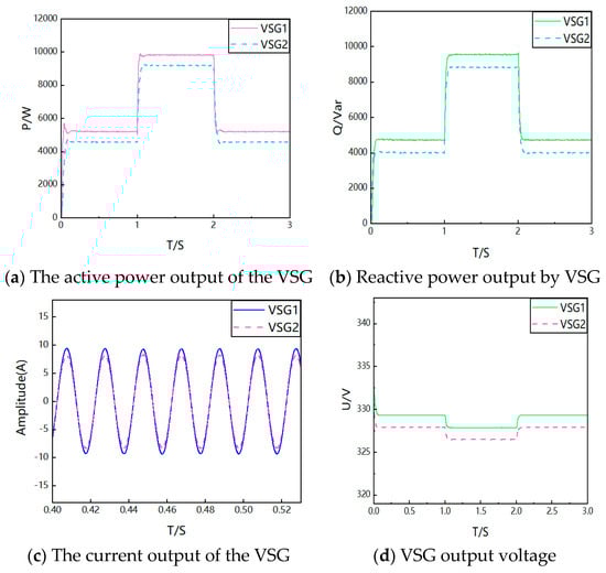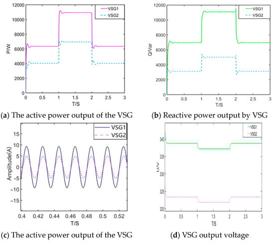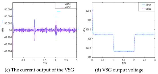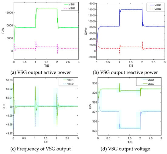 (2) The capacity of VSG1 and VSG2 virtual synchronous machines is set to 2:1, and the active and reactive power output of the system is simulated and verified, and the simulated waveform obtained is shown in Figure 17. It can be seen from the analysis of Figure 17a,b that before the (0–1 s) load 2 is switched, the ratio of active and reactive power output by the system is 2:1; (1–2 s). When the load 2 is switched, the output active power of the system is 12,000 w and 6000 w, and the reactive power is 10,000 Var and 5000 Var, the output is carried out according to the ratio of 2:1, through Figure 17c,d it can be obtained that the microgrid presents low frequency, and the fluctuation of the voltage is small, and the stable operation of the microgrid is ensured.