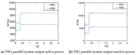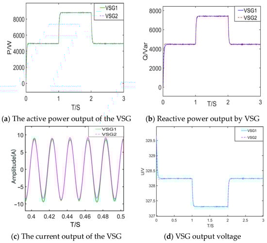 As shown in Figure 16a–c, in order to make up for the difference in line impedance, a neural network algorithm is introduced to adaptively adjust multiple parameters. When the ratio of VSG1 to VSG2 capacity is 1:1, the ratio of active and reactive power output of the two VSGs is 1:1, and the circulation is also suppressed, which improves the stability of microgrid operation.