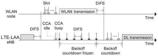 The LTE-LAA eNB first listens to the target channel to detect the energy level over a time period equal to a distributed inter-frame space (DIFS). If the detected energy level is below the predefined CCA threshold, the LTE-LAA eNB proceeds with transmission. Otherwise, if the channel is sensed as busy, it continues monitoring until the channel is deemed idle for a DIFS. Once the channel is idle, the LTE-LAA eNB selects a random number between 0 and the predefined contention window size, counting down that number of idle slots before initiating transmission. Unlike WLAN nodes, which use a binary exponential backoff in the event of a collision, the LTE-LAA eNB maintains a fixed contention window size regardless of collisions.