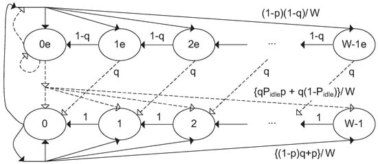 We write all probabilities in terms of and use the normalization in Equation (4) to determine . The keystone is the determination of to tackle the chain. A transition into from occurs if there is an arrival, the medium is sensed as idle, and no collision occurs. In addition, it occurs from if neither a collision nor an arrival occurs. Thus, we have the following: