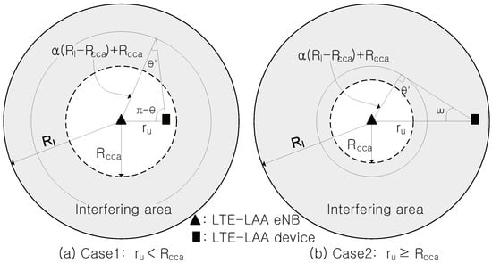 Additional care should be taken if LTE-LAA device u is located outside the CCA range of LTE-LAA eNB. We then consider two cases. In , . Otherwise, it is . For , we use the interfering area with the partial ring area defined by the range and angle as shown in Figure 3b, where and in Equation (13). For , we can calculate the interference for the range in the same way as in Equation (14). Thus, when , the cumulative interference is as follows: